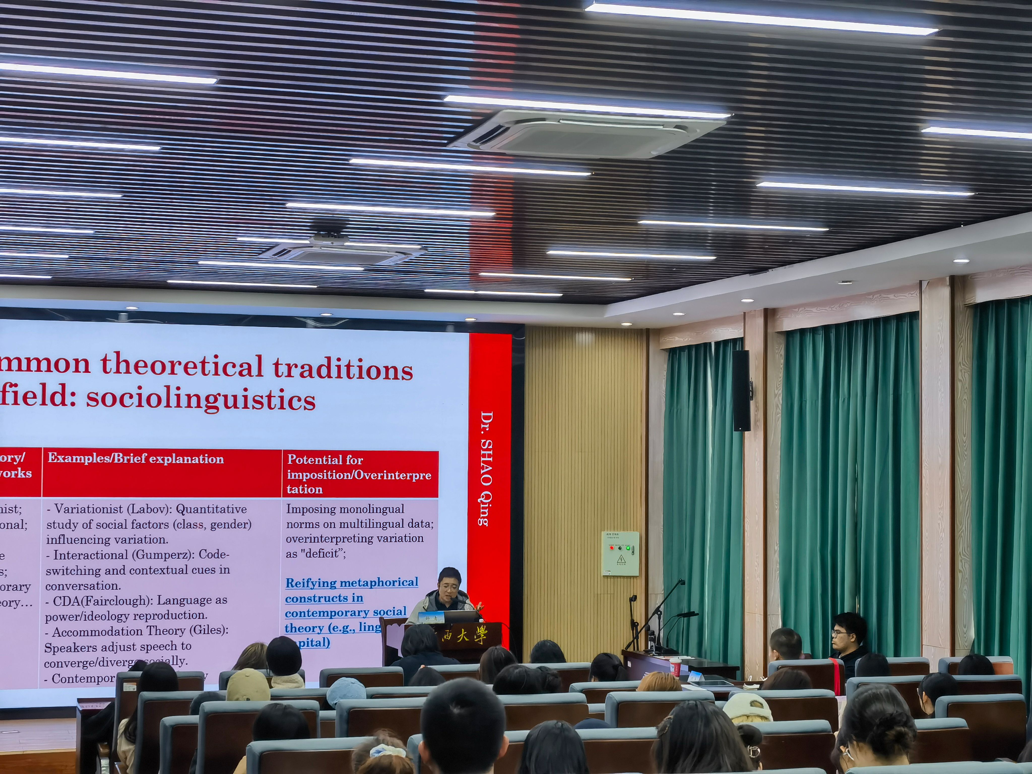 12月19日下午,“介子学术讲坛”第一百零五讲在融通报告厅举行。邵青副教授应邀做题为“语言相关研究领域的理论强置与过度解读”的学术讲座。刘英教授主持讲座。邵青副教授开篇点明,当前学术环境处于发表压力、“理论贡献”追捧、研究生规模扩张等多重现状,使得部分研究者和学生为追求快速发表或顺利毕业,陷入了“理论驱动而非实证优先”的误区,进而催生了理论强置与过度解读两大方法论问题。(邵青副教授做讲座)针对第一.../p>