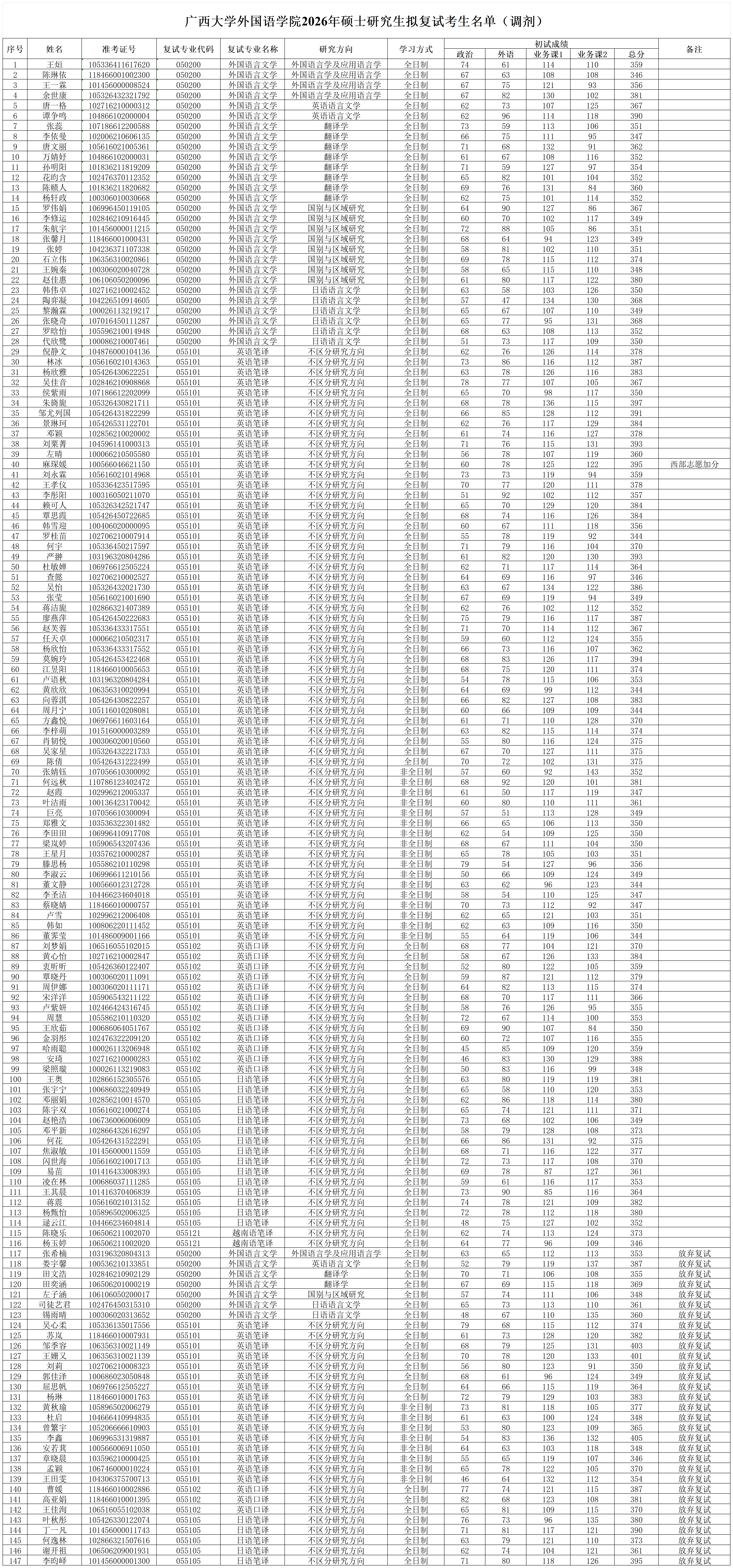 广西大学外国语学院2026年硕士研究生拟复试考生名单(调剂)